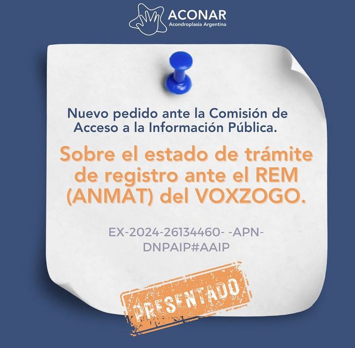Asimismo, el 22/05/24 ACONAR presentó nota ante la Administración Nacional de Medicamentos (ANMAT), solicitando la pronta evaluación del medicamento Voxzogo, sometido ante la ANMAT con fecha 13/07/2022, por encontrarse vencidos los plazos establecidos por el art. 13 de la Disp. ANMAT N° 7075/2011 que determina un plazo de 180 días hábiles administrativos, para expedirse respecto de las solicitudes de inscripción en el REM de las especialidades medicinales de origen biológico.
