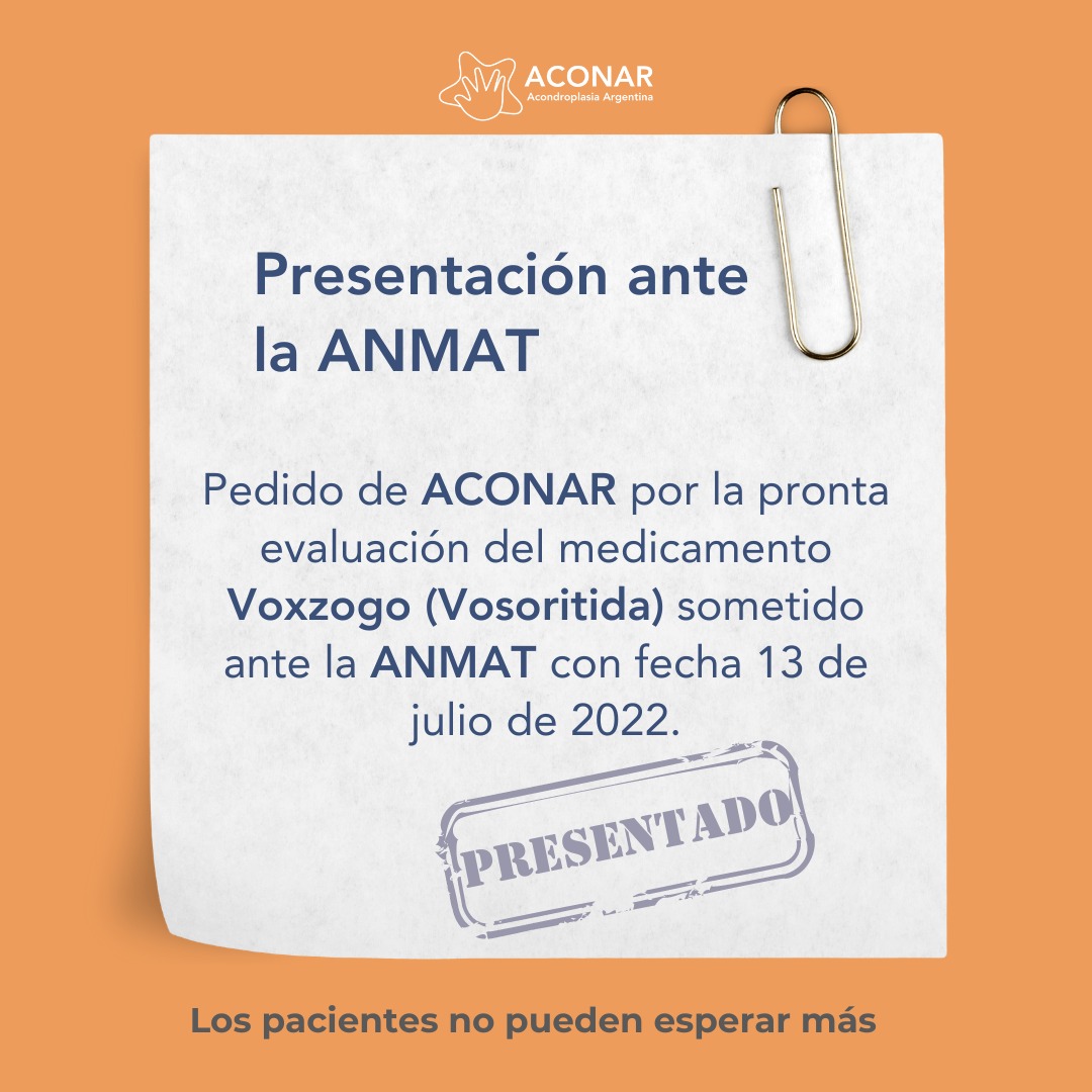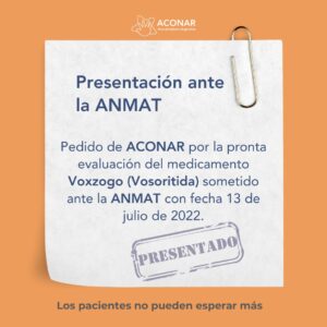 El 22 de mayo ACONAR presentó nota ante la Administración Nacional de Medicamentos (ANMAT), solicitando la pronta evaluación del medicamento Voxzogo (Vosoritida) sometido ante la ANMAT con fecha 13/07/2022, atento encontrarse vencidos los plazos establecidos por el art. 13 de la Disp. ANMAT N° 7075/2011 que establece un plazo de ciento ochenta (180) días hábiles administrativos, para expedirse respecto de las solicitudes de inscripción en el REM de las especialidades medicinales de origen biológico.